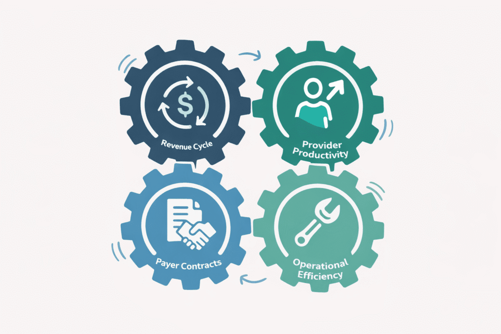 Revenue Cycle Optimization should be your first priority. Most practices lose 2-5% of their gross revenue to preventable billing errors, claim denials, and poor follow-up. By tightening your revenue cycle management, you capture revenue you’re already earning but not collecting.